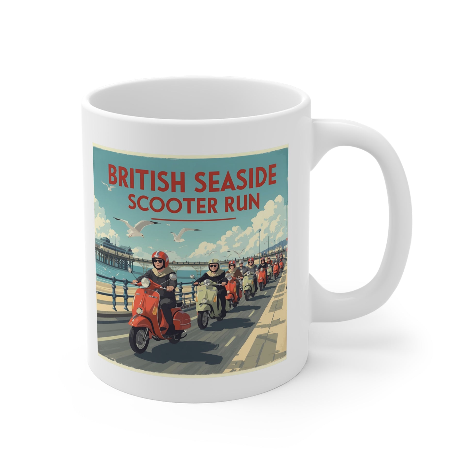British Seaside Scooter Run Mug - Retro Coffee Cup, Gift for Scooter Lovers, Summer Vibe Beverage Holder, Vintage Style Drinkware