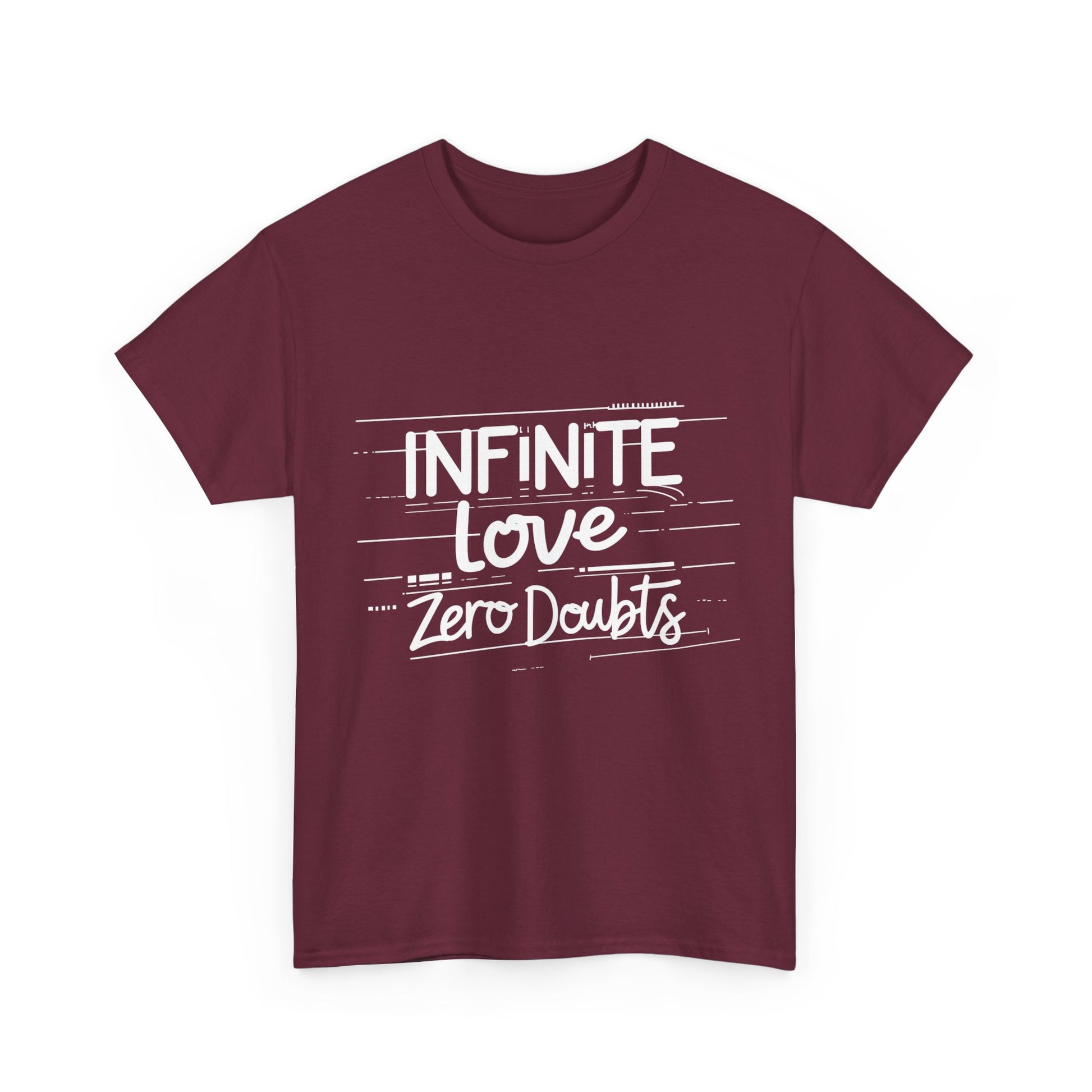 Wear your heart on your sleeve with our "Infinite Love Zero Doubts" T-shirt. This tee features a powerful message written in a stylish, graffiti-inspired font, delivering a statement of pure confidence and unwavering affection. It's for those who have found their certainty and aren't afraid to show it. This shirt is a perfect way to express a deep-seated belief in love and commitment.