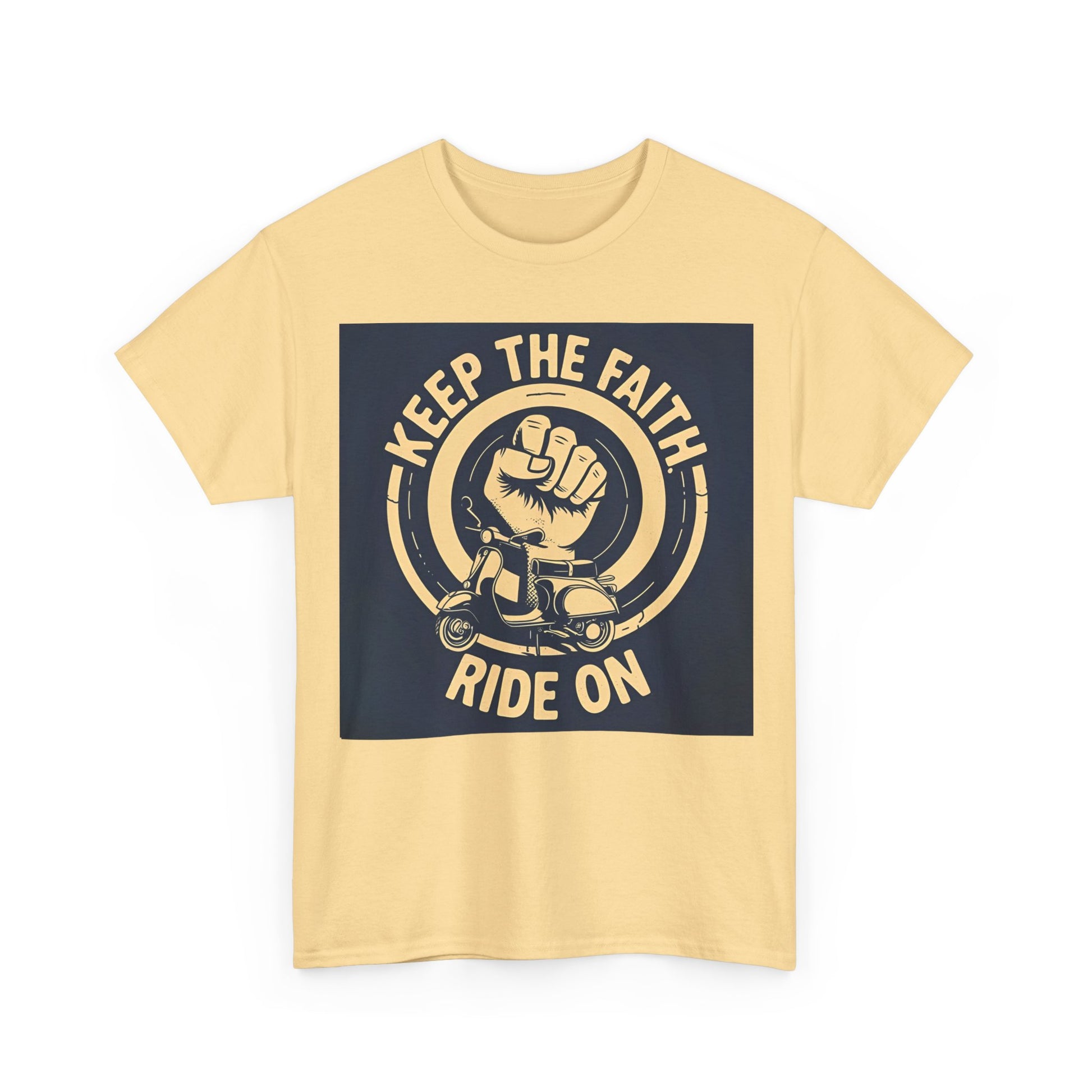 Show your dedication to the road and the dance floor with our Keep The Faith Ride On T-shirt. This vintage-inspired tee features a classic scooter and the iconic clenched fist, all framed by the legendary slogans: "KEEP THE FAITH" and "RIDE ON." It's a perfect fusion of Mod style and Northern Soul spirit, and a must-have for anyone who lives the subculture.