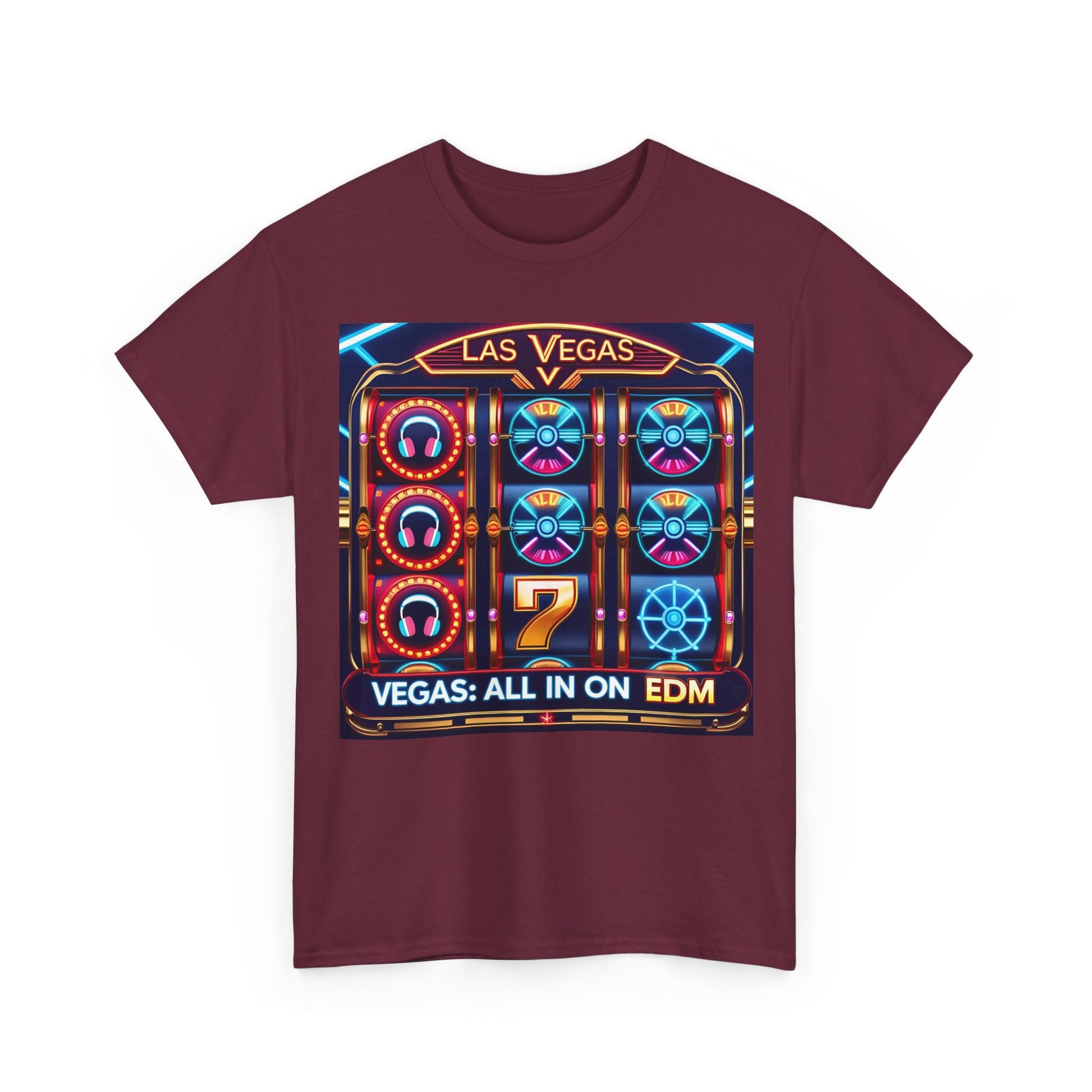 Las Vegas All In On EDM T-Shirt – Neon Slot Machine Wear – Maroon