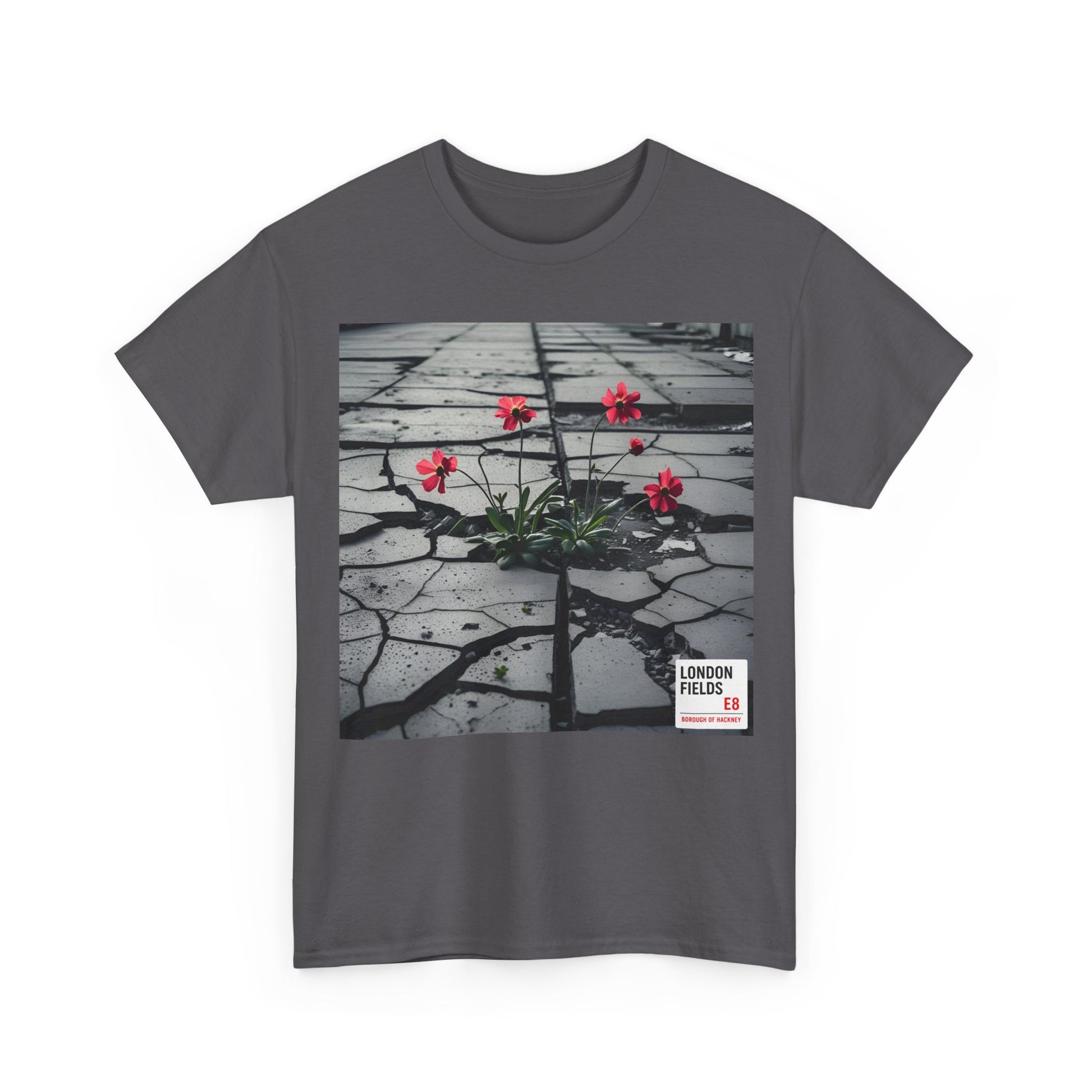 Wear a symbol of urban resilience with our London Fields E8 T-shirt. This tee features a stunning photorealistic graphic of a fragile flower thriving in a cracked pavement, with a label that proudly marks the location: London Fields, Hackney. It's a powerful statement about finding beauty and strength in unexpected places. Perfect for locals, visitors, or anyone who appreciates the unique spirit of the city.